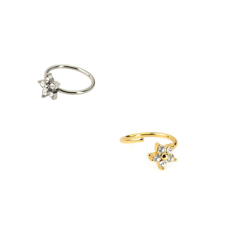 Dieser zierliche Ring aus Chirurgenstahl ist mit einer zierlichen Blume versehen, die aus fünf Edelsteinblättern um eine zentrale Perle besteht. Erhältlich in goldener oder silberner Ausführung, ist dieser Ring aus Chirurgenstahl gefertigt und somit stabil, langlebig und anlaufgeschützt. Mit seinem dünnen Gewinde (0,8 mm / 20 g) eignet sich dieser Ring ideal für Nasenpiercings, kann aber auch in Helix- und anderen Ohrpiercings getragen werden. Drehe ihn einfach zum Öffnen, führe ihn in dein Piercing ein und drehe ihn erneut, um ihn zu sichern.