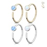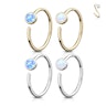 Dieser Ring besteht aus massiven 14 Karat Gold. Hier hast du die Auswahl zwischen der traditionellen Gelbgold- oder der etwas stärker gedimmten Weißgold Variante. Beide Versionen kommen in 14 Karat. Hier handelt es sich um einen endlos Ring, somit befinden sich keine sichtbaren enden an diesem Schmuck. Es gibt jedoch eine kleine Öffnung, da andernfalls der Schmuck nicht in das Piercing eingeführt werden kann. Die Enden des Rings sind leicht verdreht, somit ist der Ring wie ein Twister-Ring geformt. Auf dem Ring befindet sich ein hübscher 2,5 mm breiter Opalstein, hier handelt es sich jedoch um einen synthetischen Stein. Neben der Materialwahl kannst du auch die Steinfarbe selbst wählen, zur Auswahl stehen weiß oder blau. Der weiße Opal weist Farbtöne auf, die von Rot über Gelb bis hin zu Grün reichen, der gesamte Stein erscheint jedoch weiß. Der blaue Stein haftet an den Blautönen wie hellblau, türkis und dunkelblau.