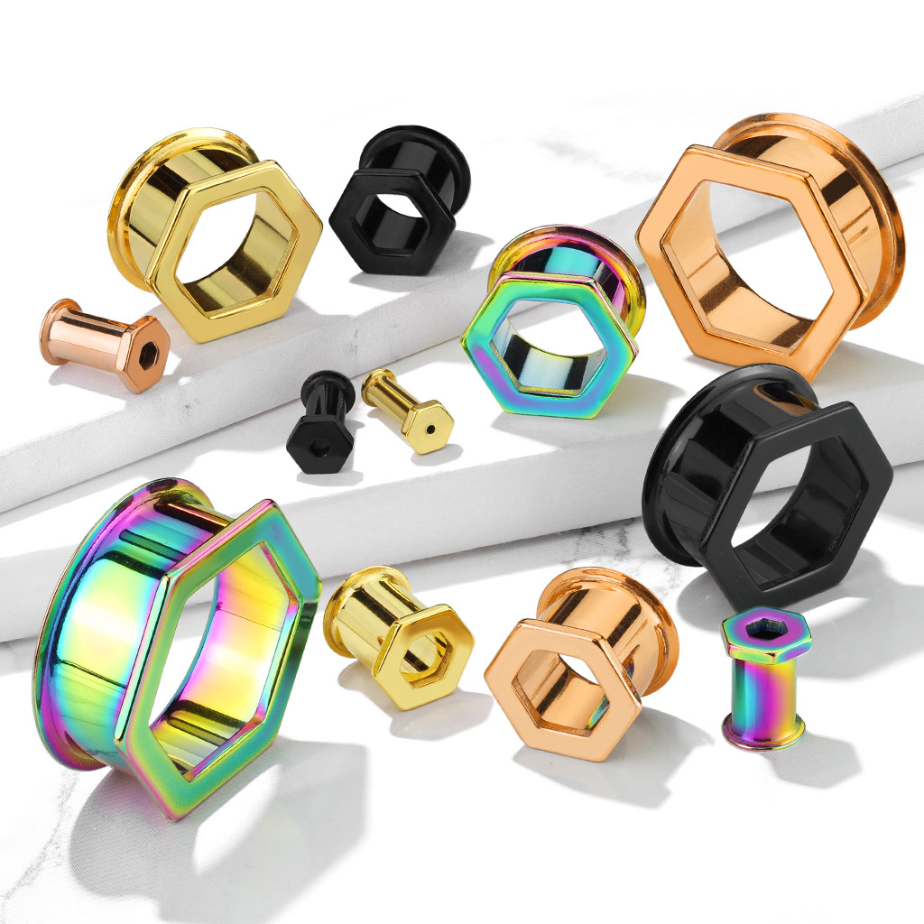 Dieser Tunnel mit einer Sechskant-Front besteht aus Chirugenstahl. Der Schmuck hat eine Erhebung hinten, daher wird dieser Tunnel auch als "Double Flared Tunnel" bezeichnet, was für eine gute Passform sorgt. Mit dieser Erhebung war es auch nicht notwendig, den Tunnel mit einem Schraubgewinde auszustatten. Es kann jedoch sein, dass sich das einführen des Schmucks als etwas schwieriger gestalten kann, der Tunnel muss nämlich durch das Dehnungsloch gedrückt werden - aber wie sagt man noch, Übung macht den Meister.