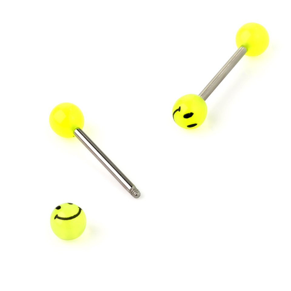 Hier bekommst du ein süßes und witziges Zungenpiercing, das im Dunkeln leuchtet und dabei noch ein Smiley trägt.