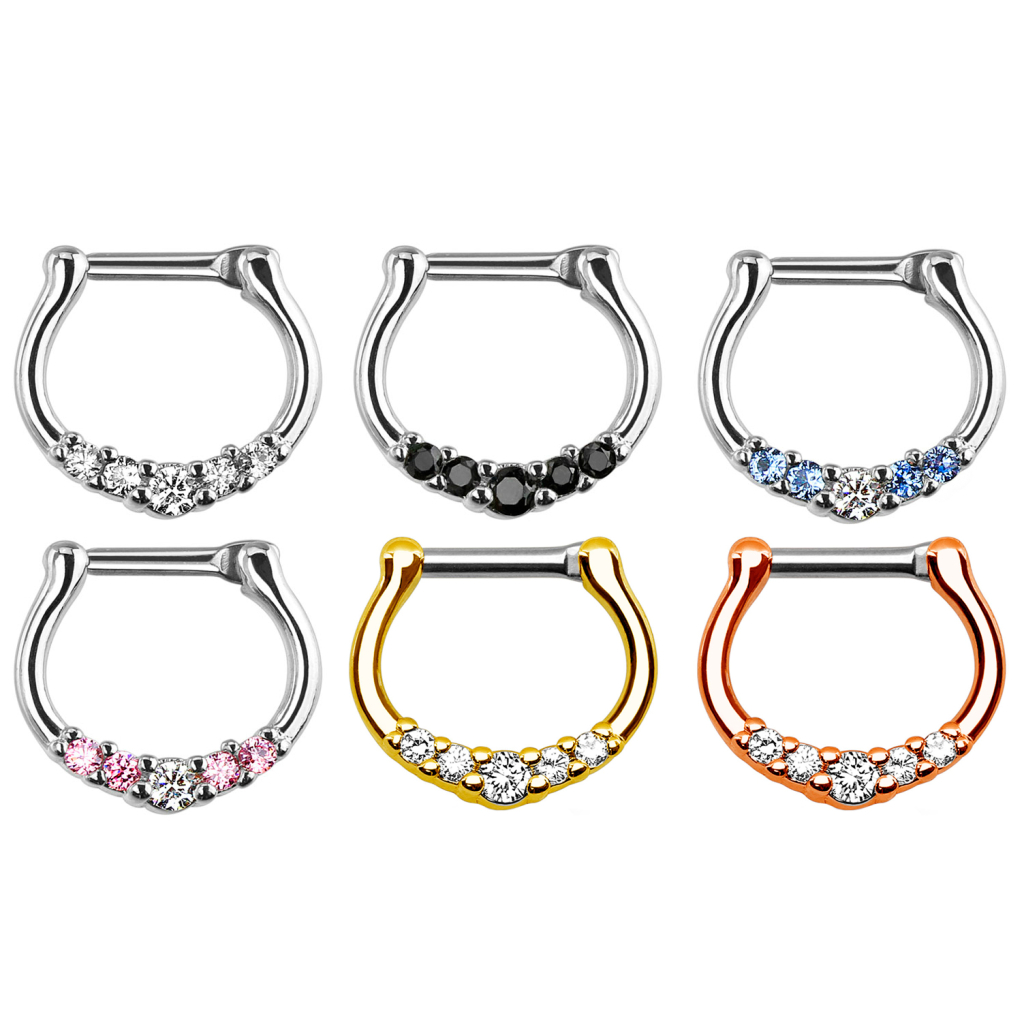 Sehr schöner und weiblicher Septumclicker aus reinem chirurgischen Stahl, ausgestattet mit fünf einfachen aber bezaubernden Steinen. Der Stein in der Mitte ist der Größte und die anderen vier Steine verleihen dem Ring einen tropfenförmiges Design.
