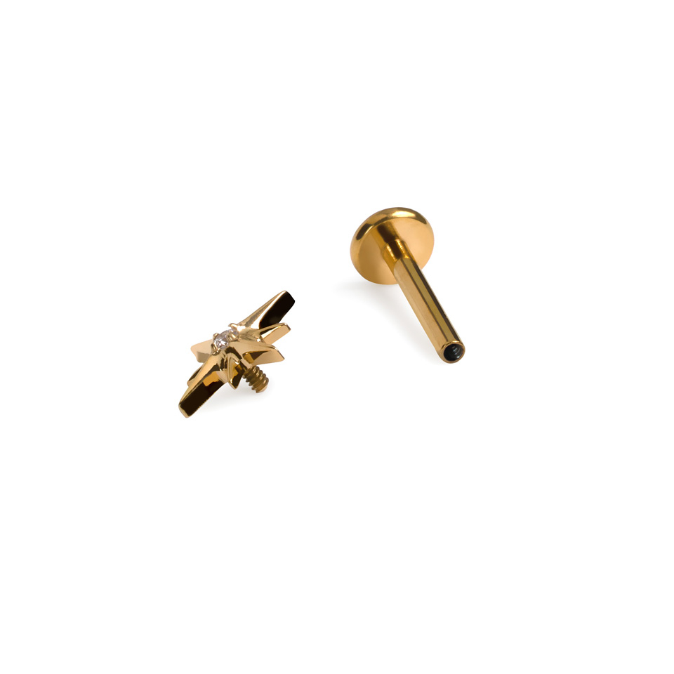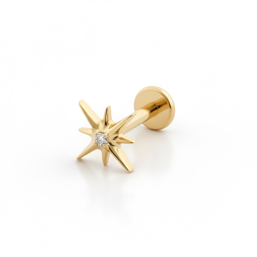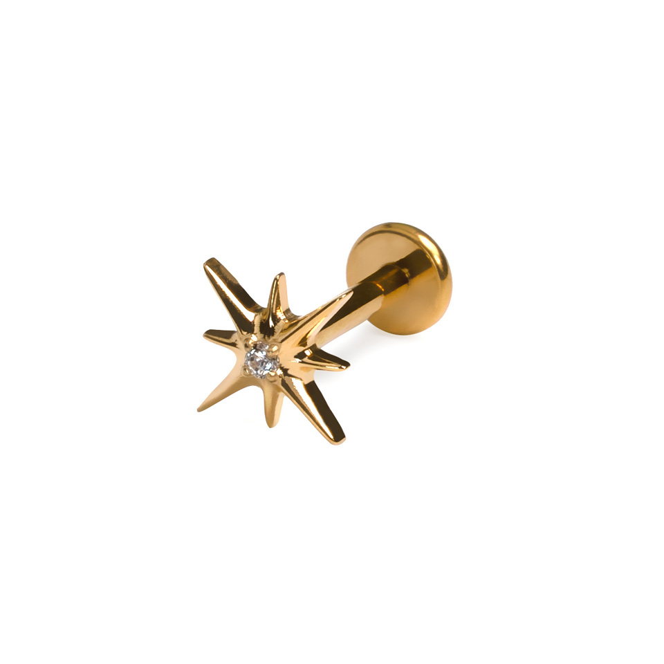Dieses Stern Titan-Labret mit Schmuckstein in der Mitte eignet sich für Liebhaber von Schmuckstücken mit kosmischem Flair. Sein sternförmiges Design umrahmt einen zentralen Schmuckstein. Erhältlich in goldener und silberner Farbe, sticht es als Detail an jedem Ohr hervor.