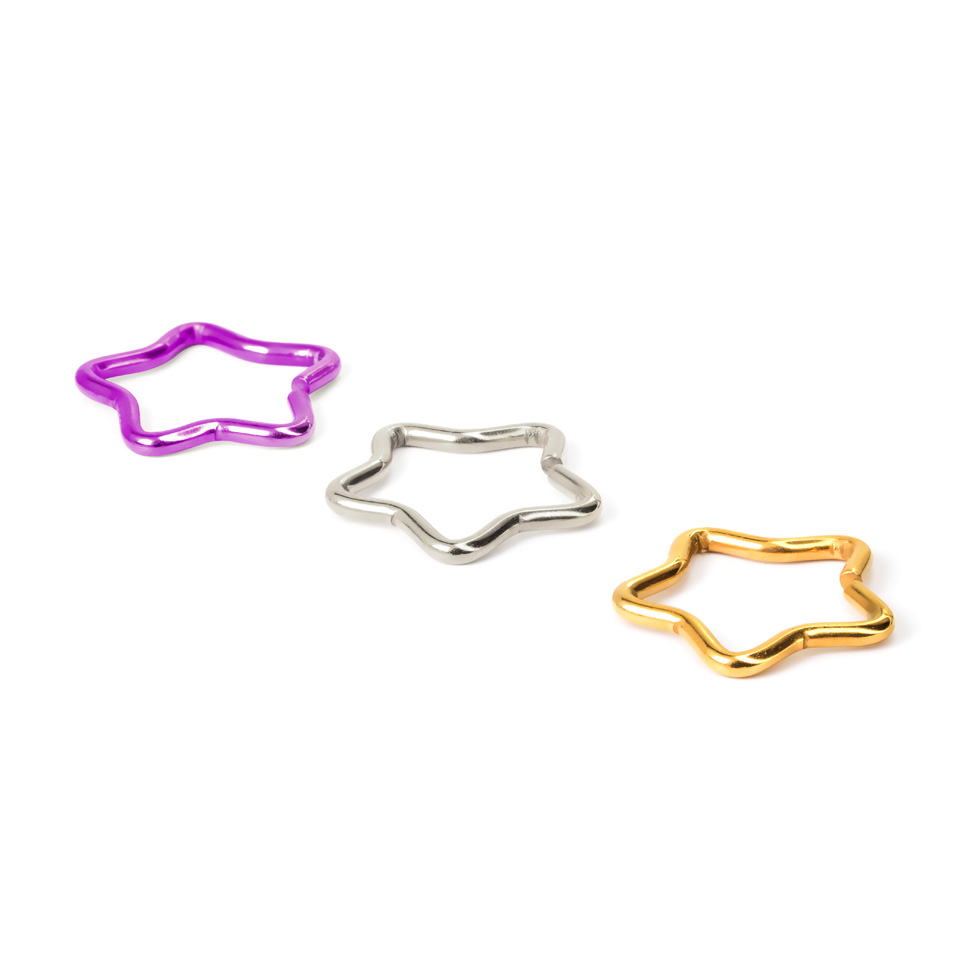 Das Schmuckstück besteht nur aus einem Stück chirurgischen Stahl, der so gebogen und geformt wurde, daß er einen typischen fünfzackigen Stern ergibt. Es ist keine Schließkugel oder ähnliches vorgesehen. Dieser Sternenring wird durch leichtes drehen (twistern) geöffnet und geschlossen, aber nur soweit, daß der Stern nicht seine Form verliert. Mit anderen Worten gesagt: der Schmuck darf nicht auseinander gerissen werden, sondern nur leicht gedreht.