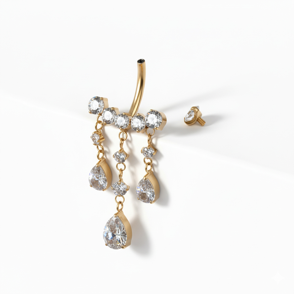 Der Titan-Bauchnabelring mit hängenden Schmucksteinen bleibt nicht unbemerkt. Mehrere Schmucksteine hängen wie zarte Tropfen, folgen jeder deiner Bewegungen und unterstreichen den Character des Schmuckstücks. Detailreich und ausdrucksstark, in perfekter Balance. Erhältlich in goldener oder silberner Farbe und perfekt für einen schickeren Look.