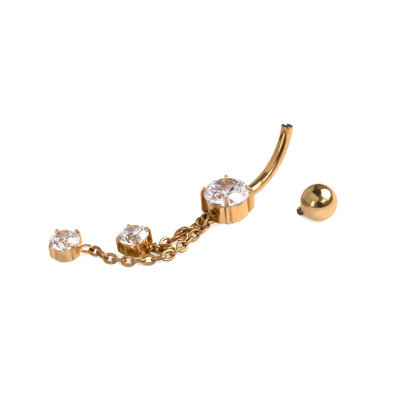 Nicht alle Bauchnabelpiercings ziehen die Blicke auf sich, aber dieser Bauchnabelring aus Titan mit Ketten und Schmucksteinen hat die Aufgabe verstanden. Ein eleganter Stab aus Titan mit einem funkelnden Stein, der von zwei zarten Ketten abgeschlossen wird, die bei jeder Bewegung herunterfallen und das Licht einfangen. Unkomplizierter Glam, denn warum nicht!