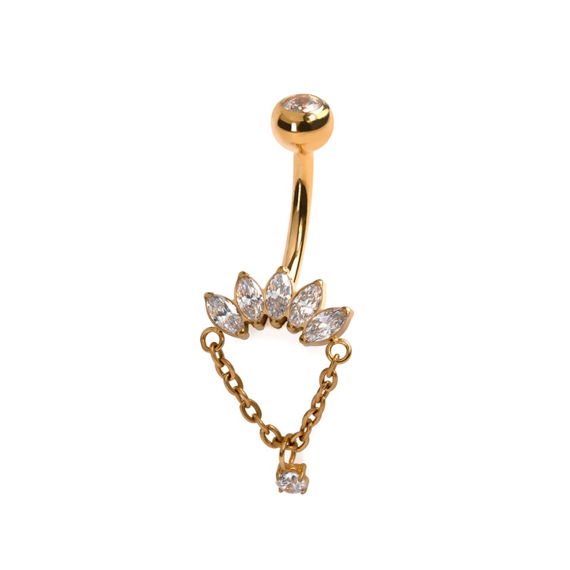 Dieser Titan-Bauchnabelring mit Steinen im Marquise-Schliff und einer Kette ist nicht einfach nur irgendein Titan-Stab. Er ist im Grunde ein Schmuckstück mit Persönlichkeit. Die Steine im Marquise-Schliff bilden eine kleine Krone, während die Kette genau das richtige Maß an Dramatik hinzufügt (denn auch dein Piercing verdient ein Spotlight).