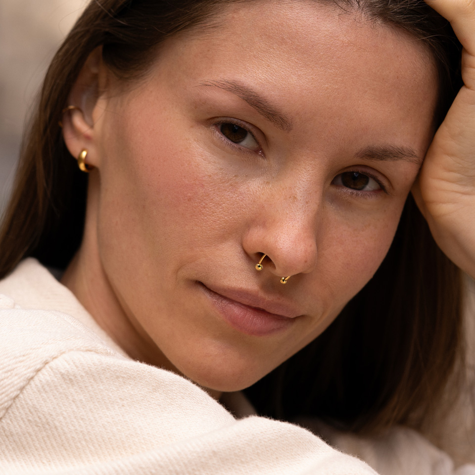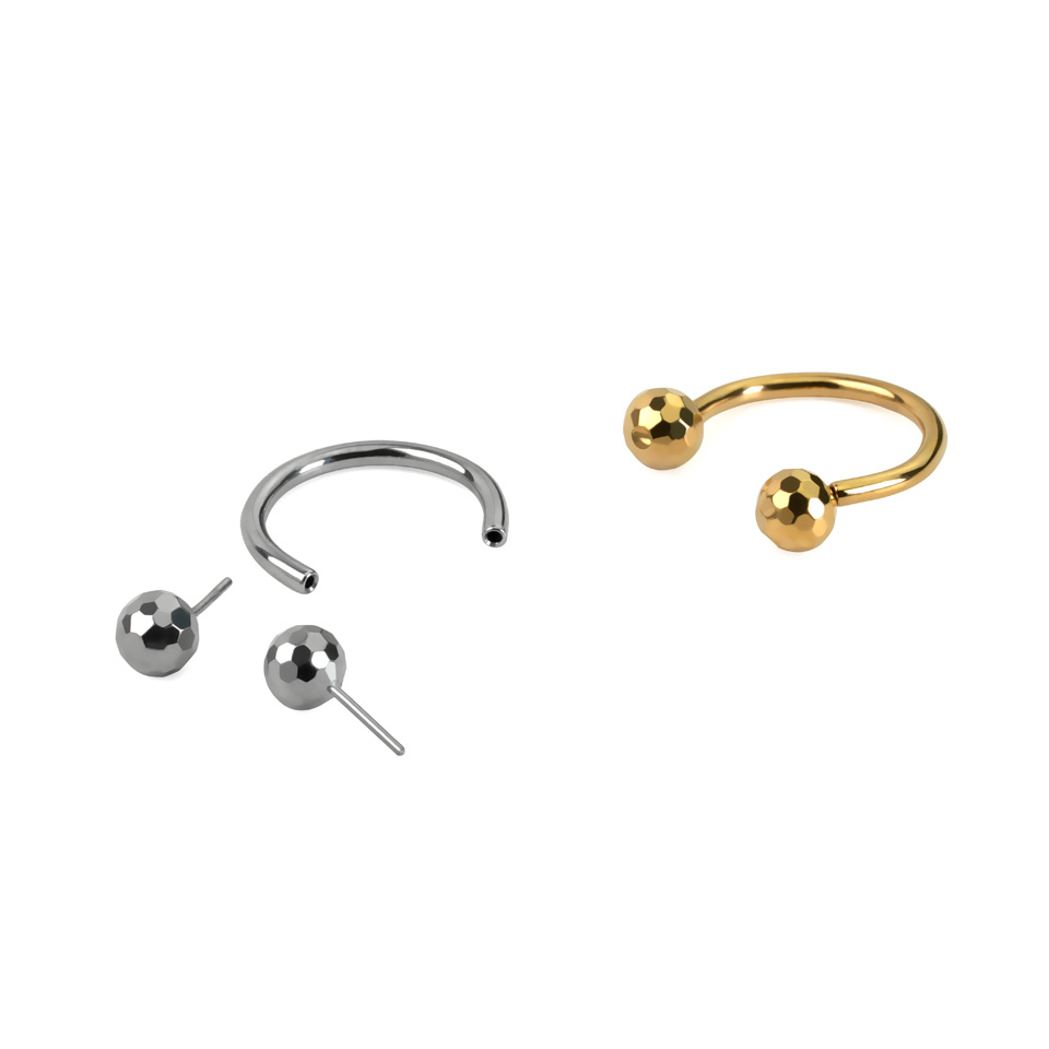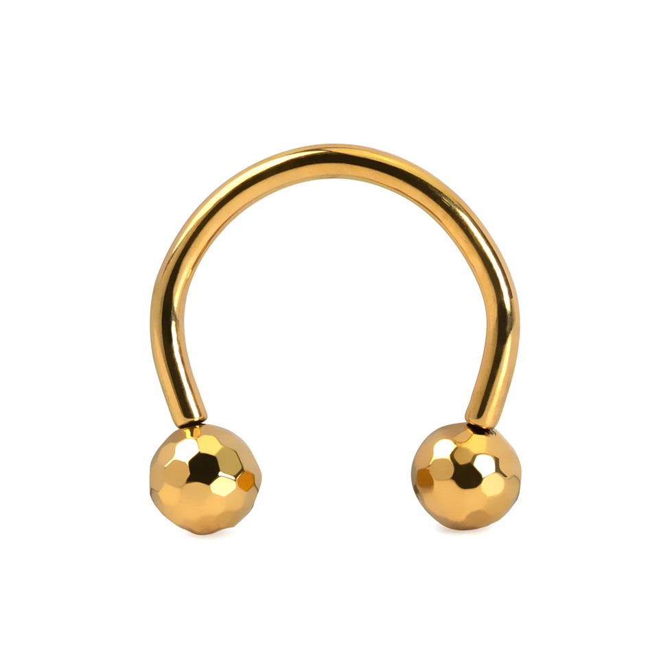 Dieses Titan Hufeisen ist gewindelos, das heißt, die Kugeln sind mit kleinen Stiften versehen, die in das Hufeisen gedrückt werden, um es in deinem Piercing zu befestigen. Die Kugeln sind facettenreich, was einen coolen, texturierten Look ergibt, der an Mini-Discokugeln erinnert. Dieser Schmuck eignet sich für verschiedene Piercings, darunter Augenbrauen-, Ohr- und Septum-Piercings, und ist in Gold- oder Silberausführung erhältlich.