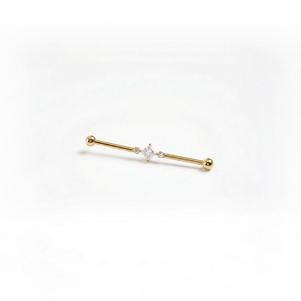 Titan-Industrialstab mit viereckigem Schmuckstein lenkt den Blick genau dorthin, wo er hingehört. Ein quadratisch geschliffener Schmuckstein sitzt in der Mitte, eingerahmt von kleineren Schmucksteinen auf beiden Seiten, was einen hübschen Effekt erzeugt. Erhältlich in den Farben Gold und und Silber, setzt er Akzente, ohne von der klaren Form eines Industrialpiercings abzulenken.