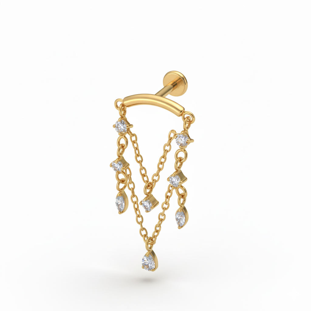 Das Titan-Labret mit Chandelier-Anhängern setzt ganz auf Bewegung. Kleine, steingesetzte Tropfen baumeln unter dem Labret und schwingen leicht mit, was du bei jeder Kopfdrehung merken wirst. Schlicht, jedoch stilvoll, ideal, wenn du mal was anderes als dein Alltagsschmuck möchtest. Erhältlich in goldener und silberner Farbe.