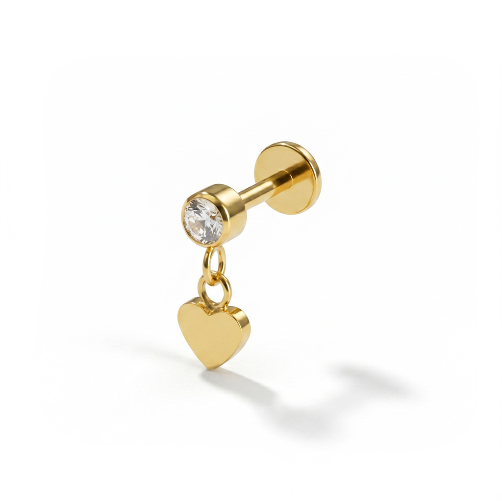 Das Titan-Labret mit Herz-Anhänger hält sich auf den ersten Blick dezent, bringt dann aber ein kleines Detail mit, das den ganzen Look verändert. Oben sitzt ein in Zargenfassung eingefasster Schmuckstein, darunter hängt ein herzförmiger Anhänger, der ein bisschen Dynamik bringt und perfekt allein oder in Kombination mit anderen Schmuckstücken passt. Erhältlich in den Farben Gold und Silber.