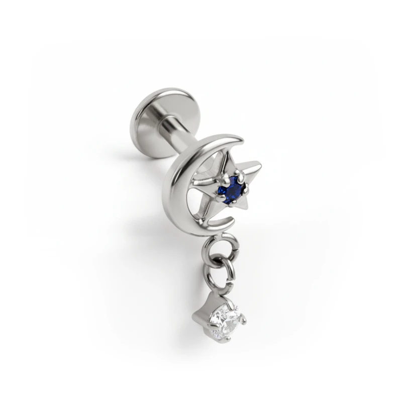 Das Titan-Labret mit Mond und Stern mit Anhänger bringt Bewegung in deinen Look. Vorne sitzen ein kleiner Mond und ein Stern, dazu ein winziger Anhänger, der bei jeder Bewegung sanft mitschwingt. Dekorativ, ohne zu übertreiben, und perfekt, wenn du etwas ausdrucksvolleres willst. Erhältlich in goldener und silberner Farbe.