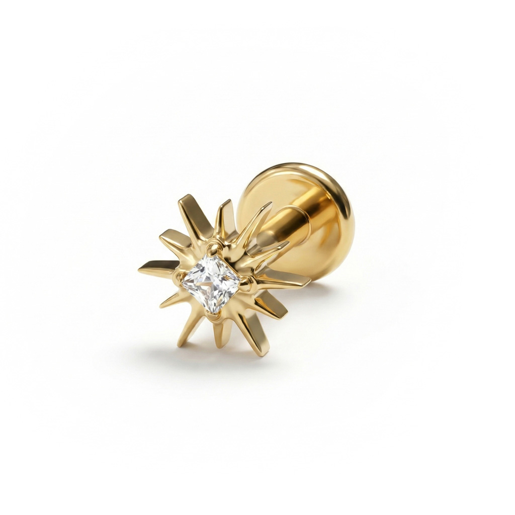 Verleihe deinem Ohr-Stack einen Hauch von Glanz mit diesem Titan-Labret mit Sonnenstrahlen. Das blumeninspirierte, lichtreflektierende Design sorgt für eine dezente Tiefe, bleibt dabei aber klar und alltagstauglich.