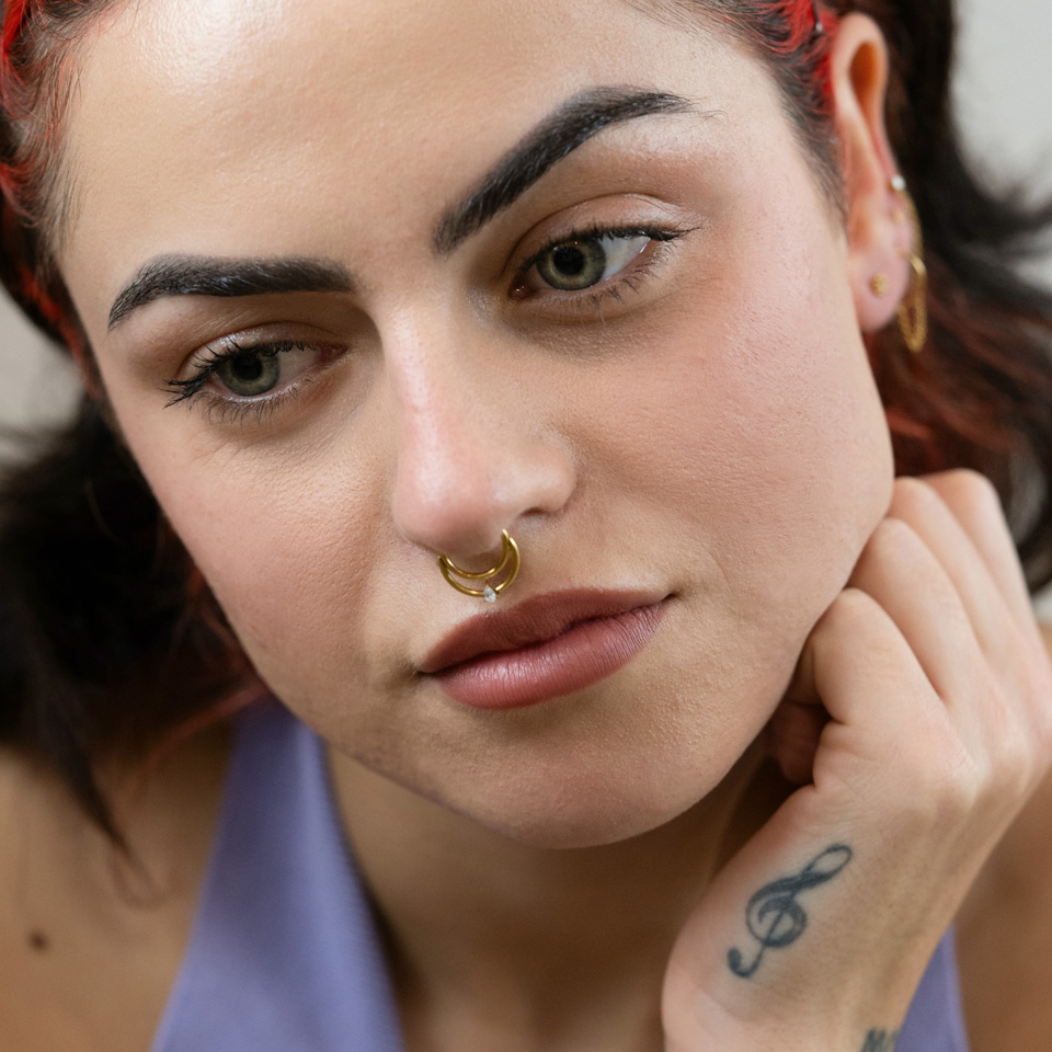 Titan-Scharnierring mit einem tropfenförmigen Stein, verteilt auf 2 Ringe. Dieser wunderschöne Ring strahlt Eleganz aus. Die zeitlose Tropfenform des Steins, der die beiden Ringe miteinander verbindet, macht ihn zu einem Unikat. Er ist sowohl in goldenen als auch in silbernen Farben erhältlich. Der Ring hat eine Stabstärke von 1.2 mm und Durchmesser von 8 mm und 10 mm, wodurch er sich perfekt für Helix-, Daith-, oder Septumpiercing eignet.