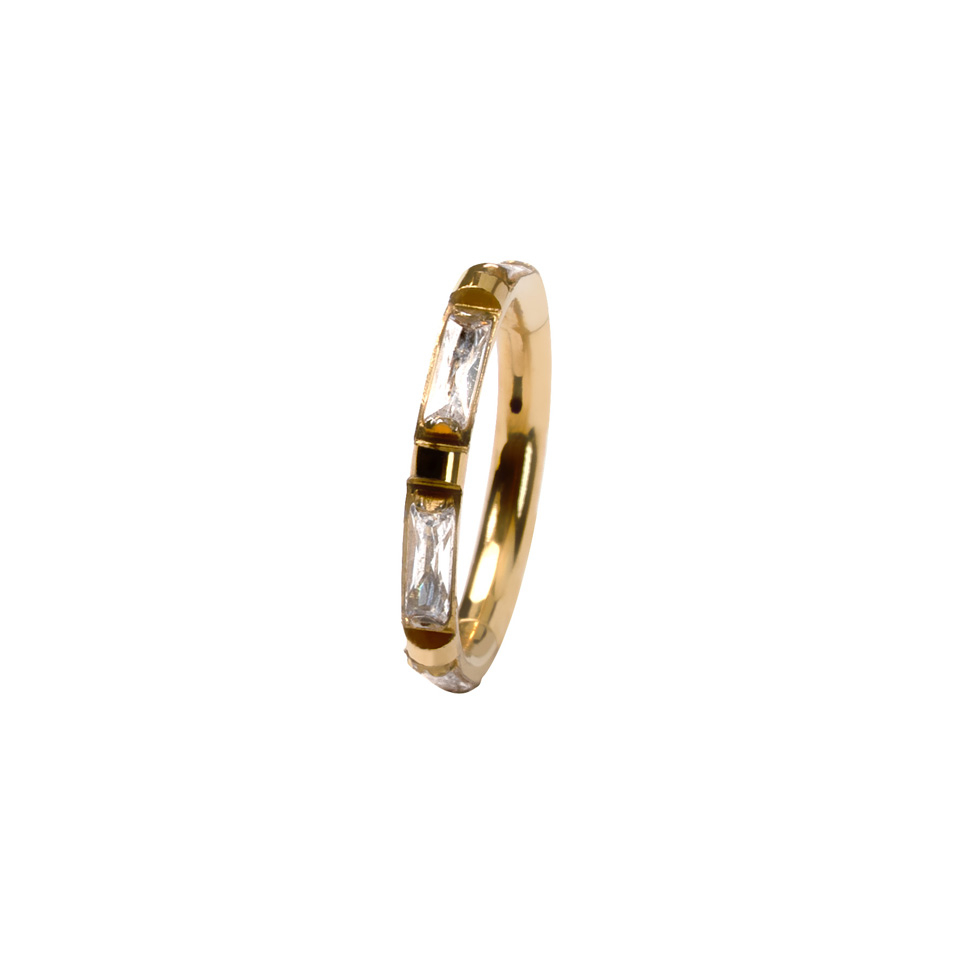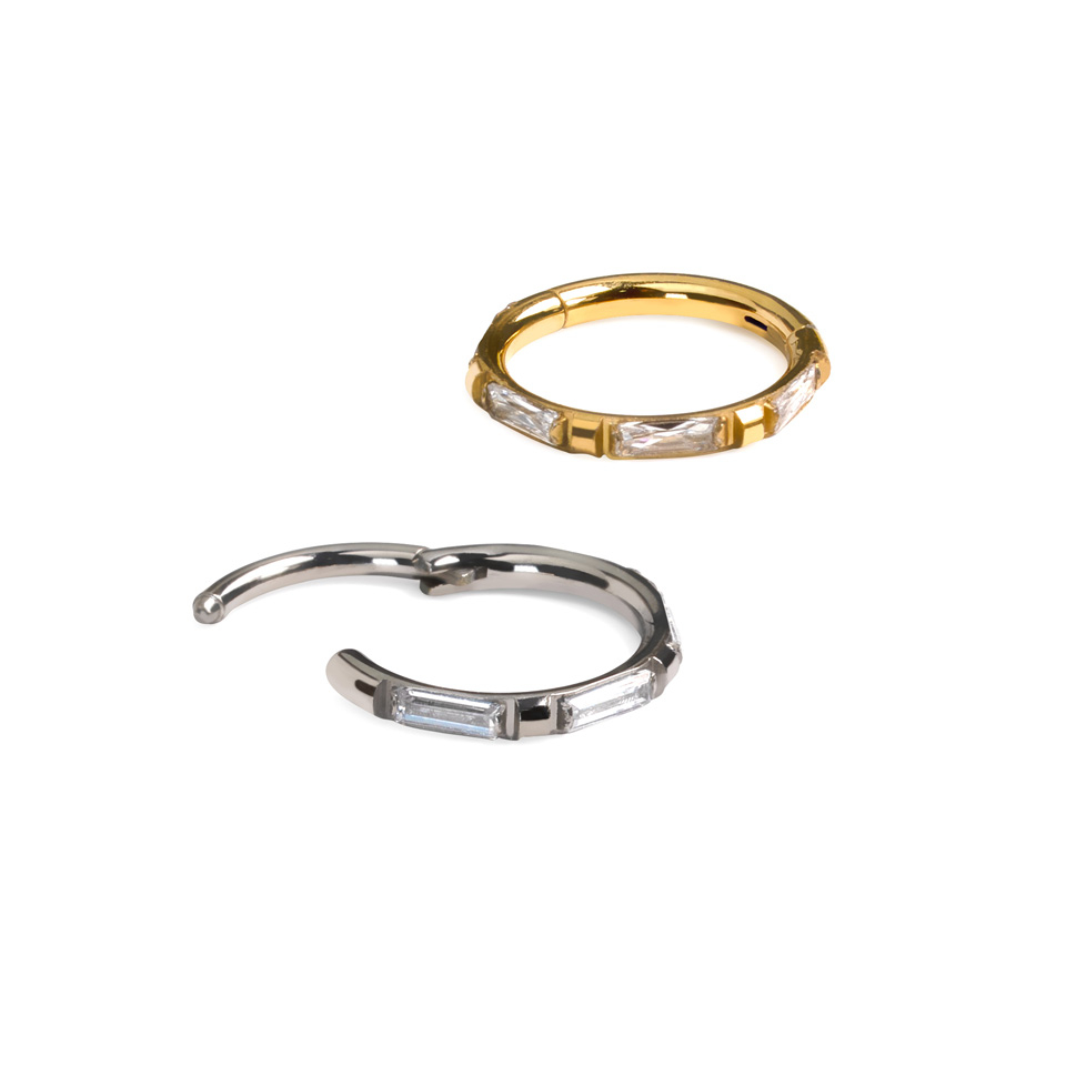 Dieser Titanring mit Steinen im Baguette-Schliff zeichnet sich durch ein schickes Design aus, bei dem sich rechteckige Zirkoniasteine im Baguette-Schliff und winzige Metallvierecke an der Außenseite des Rings abwechseln. Da es sich um einen Scharnierring handelt, lässt er sich leicht befestigen und in dein Piercing einsetzen. Da er aus Titan gefertigt ist, ist dieser Ring hypoallergen, beständig und wasserfest.