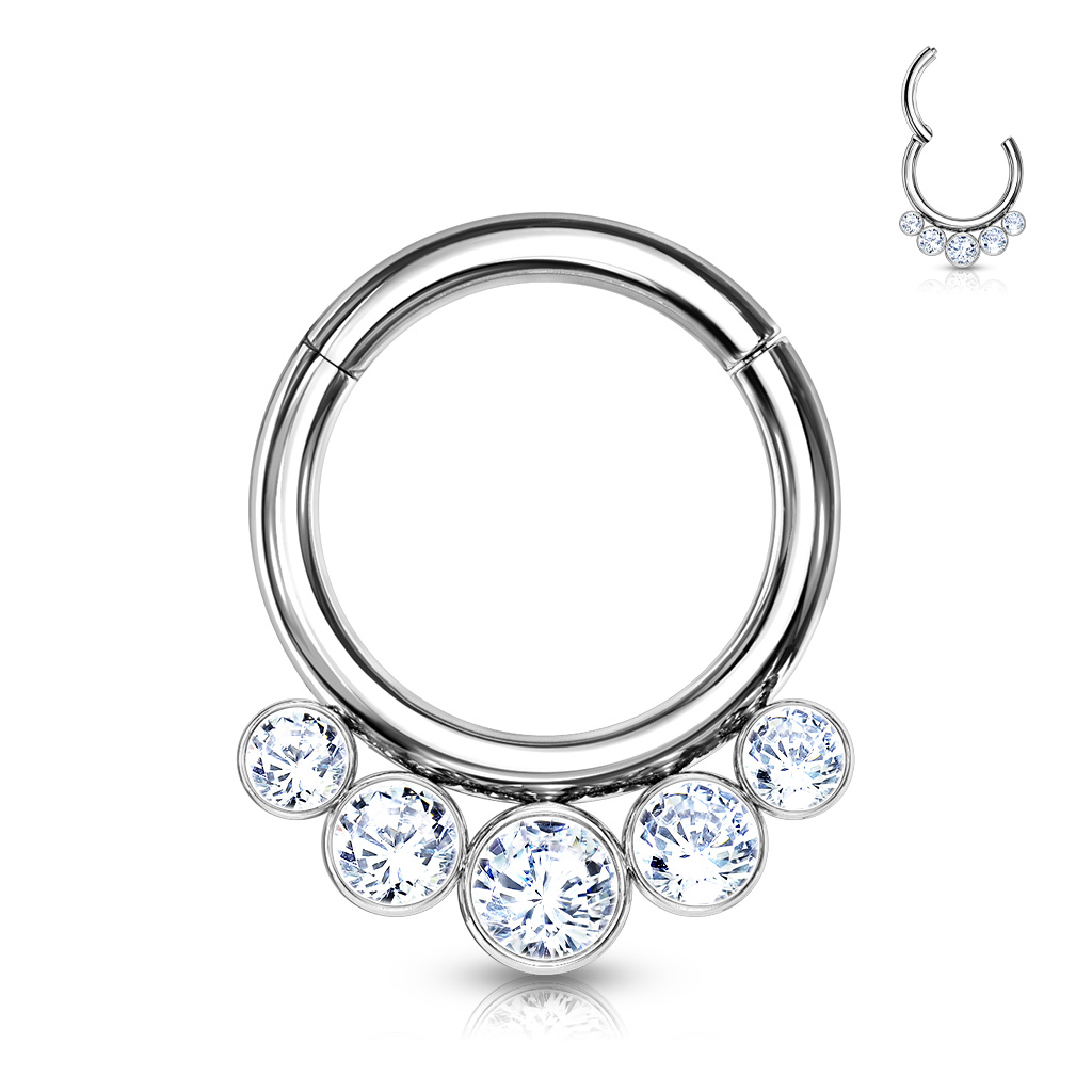 Dieser Ring ist aus Titan gefertigt, eines der besten Materialien, die du deinem Piercing bieten kannst. Das ist auch der Grund, warum er bei neuen Piercings als Initialschmuck verwendet wird. Der Ring hat eine Stärke von 1,2 mm und ist in den Durchmessern 8 mm und 10 mm erhältlich. Egal welchen Durchmesser du auswählst, der Ring hat fünf Steine an der Unterseite. Der Stein in der Mitte ist der größte und die Steine zu den Enden hin werden kleiner, wie bei einem gebogenen Cluster.