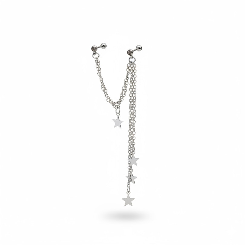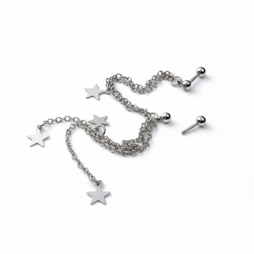 Hast du zwei Ohrlöcher? Ein Helix- und ein Traguspiercing? Dann kannst du hier süße Sterne und dein Piercing miteinander verbinden, denn dieser Schmuck ist wird von Sternen geziert. Die einzige Voraussetzung ist natürlich, daß du ein Tragus- und Helixpiercing im Ohr hast. Der Schmuck besteht nämlich aus zwei kleinen Stäben und einer langen Kette, die beide Stäbe verbindet.