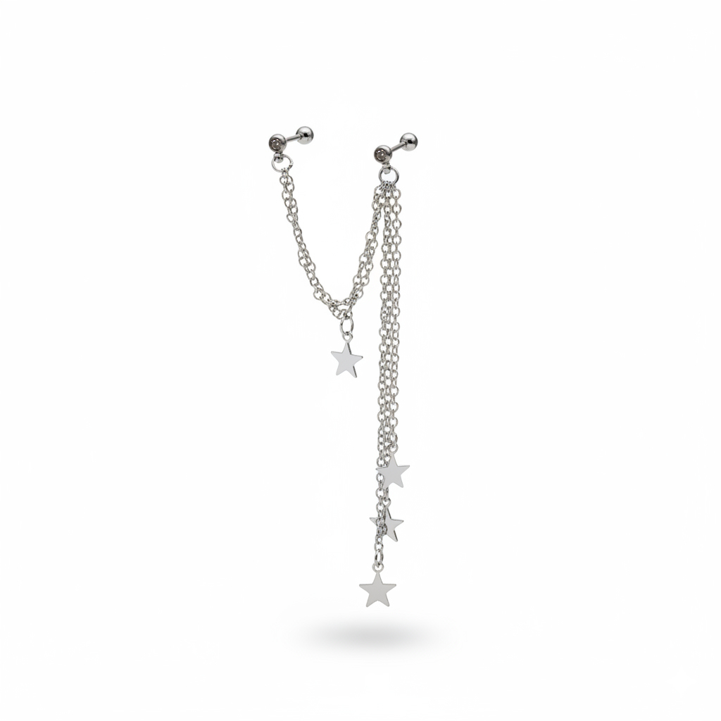 Hast du zwei Ohrlöcher? Ein Helix- und ein Traguspiercing? Dann kannst du hier süße Sterne und dein Piercing miteinander verbinden, denn dieser Schmuck ist wird von Sternen geziert. Die einzige Voraussetzung ist natürlich, daß du ein Tragus- und Helixpiercing im Ohr hast. Der Schmuck besteht nämlich aus zwei kleinen Stäben und einer langen Kette, die beide Stäbe verbindet.