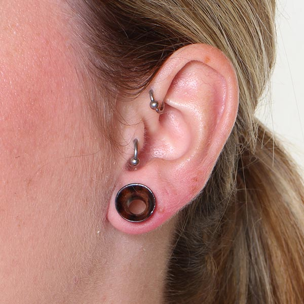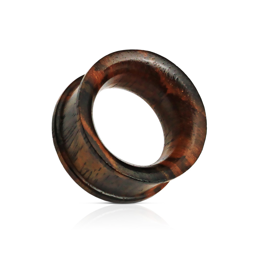Dieser Tunnel wurde aus dem schönen Rosenholz geschaffen und im "Double Flat Flare" gestaltet, was bedeutet, dass der Schmuck zwei hohe Kanten und eine etwas schmalere Innenseite hat, die im Ohrloch sitzt.