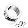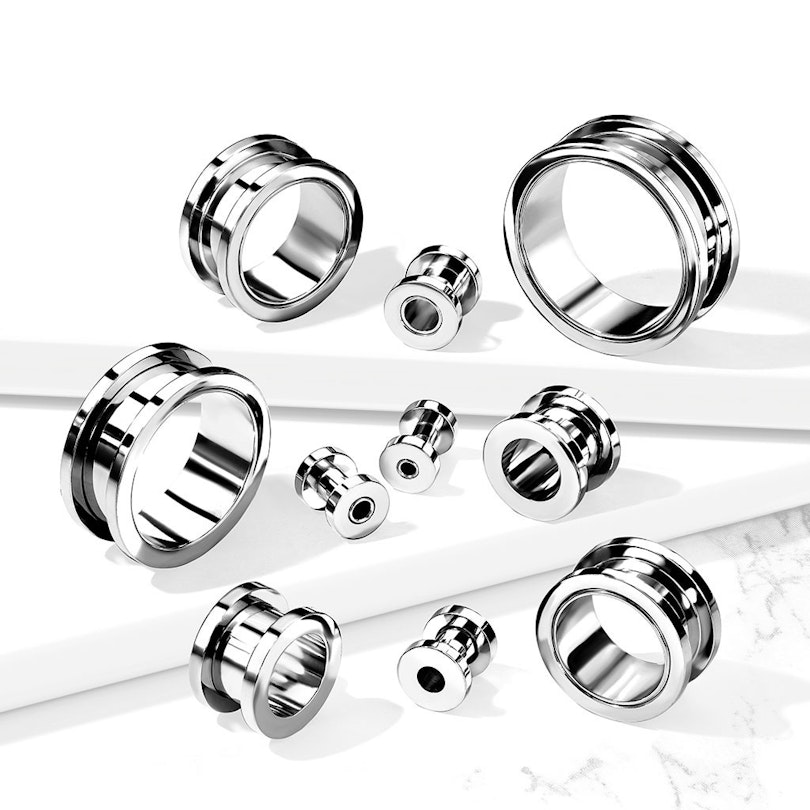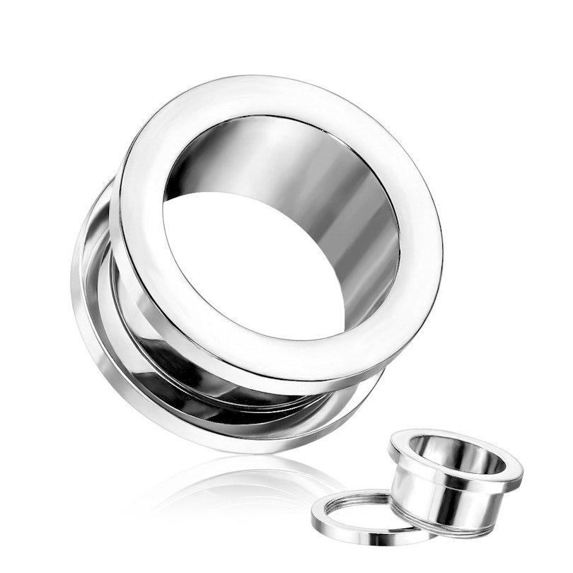 Der Tunnel wird, wie der Name auch andeutet, mit einem Schraubengewinde geliefert. Dies bedeutet, dass die Rückseite des Tunnels abgeschraubt werden kann, so dass es einfacher ist, den Tunnel einzusetzen oder rauszunehmen. Der Tunnel ist in Größen von 8 g (3 mm) bis 1 Zoll (25 mm) erhältlich.