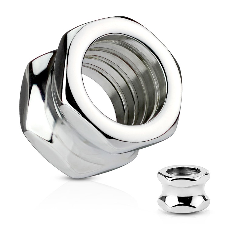 Hexa bedeutet 6, was eigentlich schon die Form dieses sechseckigen Tunnels erklärt - genau wie eine Schraubmutter. Auf der Innenseite des Tunnels sind kleine Ringe, die wie das Gewinde einer Schraubmutter aussehen. Du kannst dieses Schmuckstück in sechs verschiedenen Größen bestellen. Die kleinste Größe beginnt bei 6 mm und endet bei 16 mm.