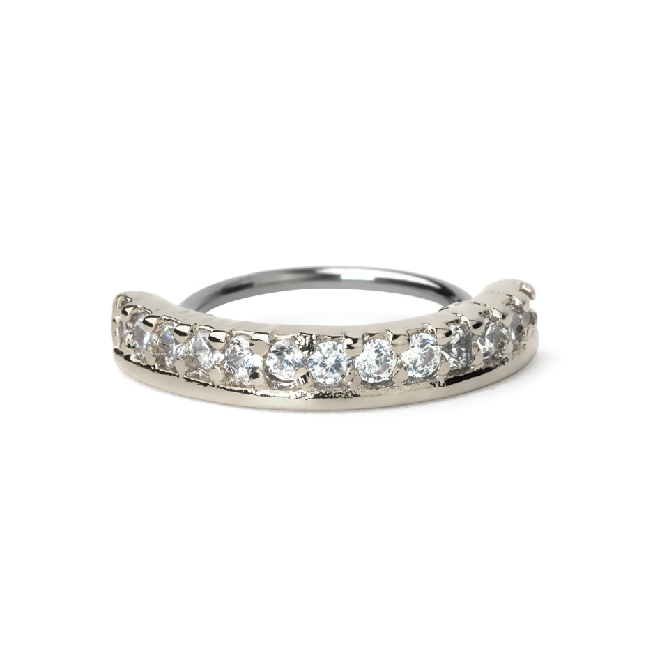 Die hautberührende Ringseite besteht aus Chirurgenstahl, die Verzierung aus Messing. Um ihn einzusetzen, drehst du ihn vorwärts oder rückwärts, so dass er ein S bildet; sobald du ihn durch dein Piercing gesteckt hast, schließt er sich von selbst.