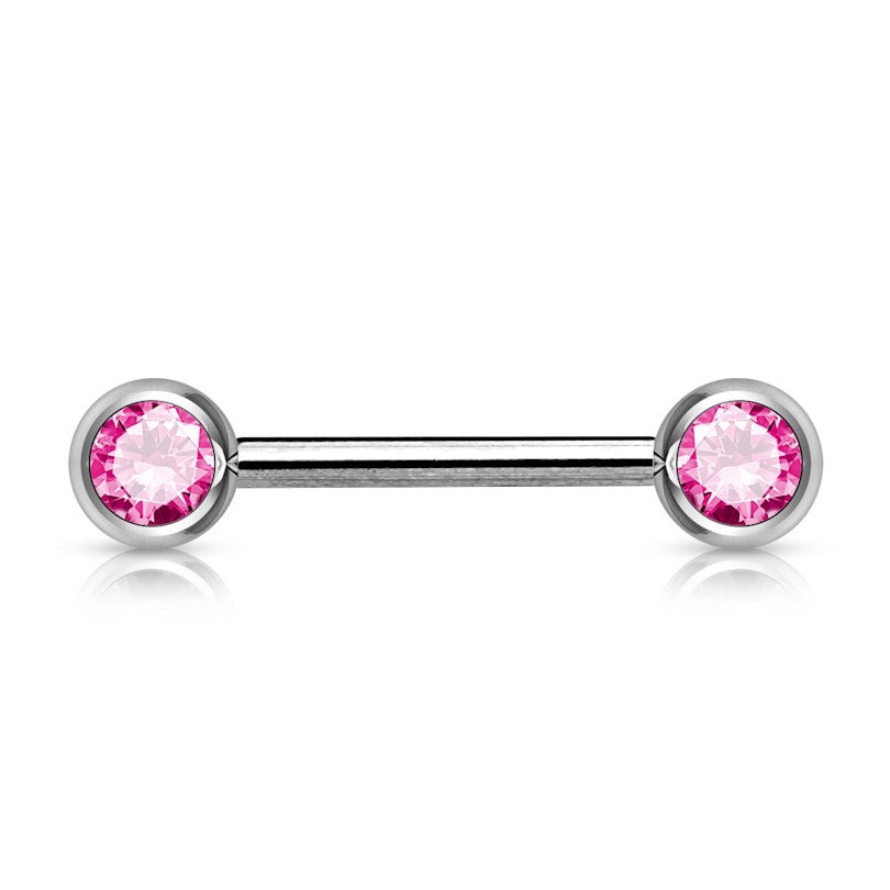 Dieses Brustwarzenpiercing ist ganz schlicht gehalten. Es ist ein gerader Stab mit zwei Kugeln - Eine an jedem Ende. Beide Kugeln sind mit einem einzelnen Stein versehen, der hier, nicht wie bei den meisten anderen Kugeln oben auf sitzt, sondern nach vorne zeigt, was diesen Schmuck ideal für ein Brustwarzenpiercing macht, da man ja die Steine gut sehen kann. Das setzt natürlich voraus, dass das Schmuckstück nicht verkehrt eingesetzt ist.