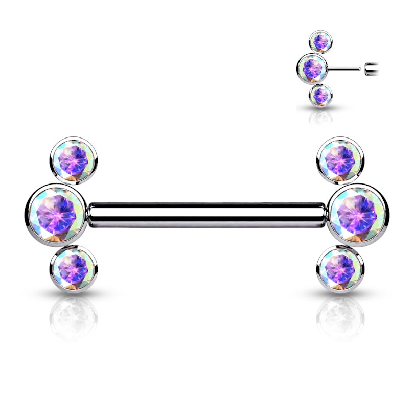 Gewindeloses Brustwarzen-Barbell mit 3 CZ Bezel Endstücke.