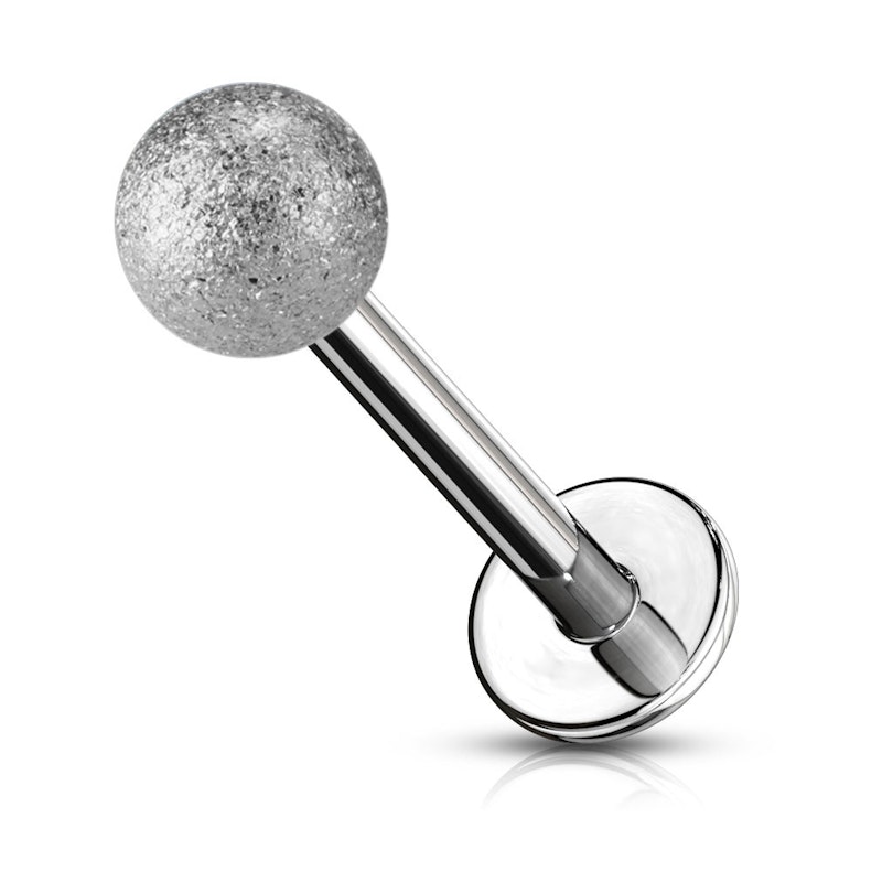 Am entgegengesetzten Ende der Platte, sitzt die Kugel auf dem Schmuck. Die diesem Falle besteht diese Kugel aus Chirurgenstahl mit einer rauen und unebenen Fläche, da diese mit einem Sandgebläse bearbeitet wurde um diesen speziellen Look zu erhalten. Diese Technik wird verwendet, um der Kugel einen Look zu verleihen, der gemahlenen Diamanten ähnelt, so dass die Kugeln unglaublich schön im Licht glimmern und glitzern.