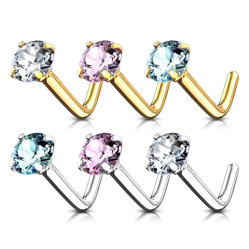 Das Nasenpiercing hat einen weichen, kleinen Knick in der Mitte des Stabes, der dafür sorgt, daß das Schmuckstück sicher und fest in der Nase sitzt, ohne diese auf der Innenseite durch einen geraden Stab zu verletzen. Das Design ist also auch praktisch und zugleich einfach zu handhaben, ähnlich wie bei einem Nasenstecker.