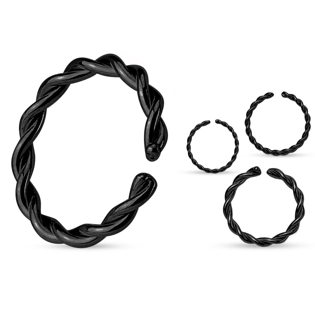 Hier siehst du eine etwas andere Ausgabe unseres wirklich beliebten endlosen Ringes. Unser normaler Ring besteht aus einem Stück Metall, dessen Enden sich in einem Ring treffen. Bei diesem endlosen Ring wurden zwei Stücke Metall verwendet, die zunächst miteinander verzwirbelt und erst dann zu einem Ring geformt wurden, das Ergebnis gleicht einem geflochtenen Look. Die Ringenden wurden geschweißt, die dann anschließend schön abgerundet wurden, damit jedes Piercing beim Einsetzen oder Herausnehmen geschont wird, aber auch um die beiden Metallstücke zusammen zu halten, damit sie nicht auseinander fallen können.