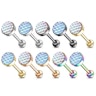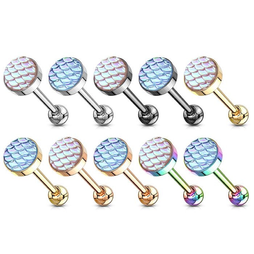 Hier kannst du ein besonderes und dezentes Zungenpiercing begutachten. Die obere Kugel wurde mit einem farblich nuancierten Muscheldesign verziert. Dieses Muscheldesign besteht aus Harz und kann zwischen verschiedenen Farbnuancen der Hauptfarbe wechseln, welche du für den Schmuck auswählst. Wenn du also beispielsweise die Hauptfarbe rosa auswählst, dann kannst du auch Farbnuancen wie rot und weiß erkennen. Neben der Farbe des Muscheldesigns kannst du auch die Farbe des Stabs selbst auswählen. Somit gibt dir dieses Piercing die Möglichkeit, ein individuelles und personalisiertes Zungenpiercing zu erhalten - jede Kombination gibt dem Zungenpiercing einen neuen und frischen Look.