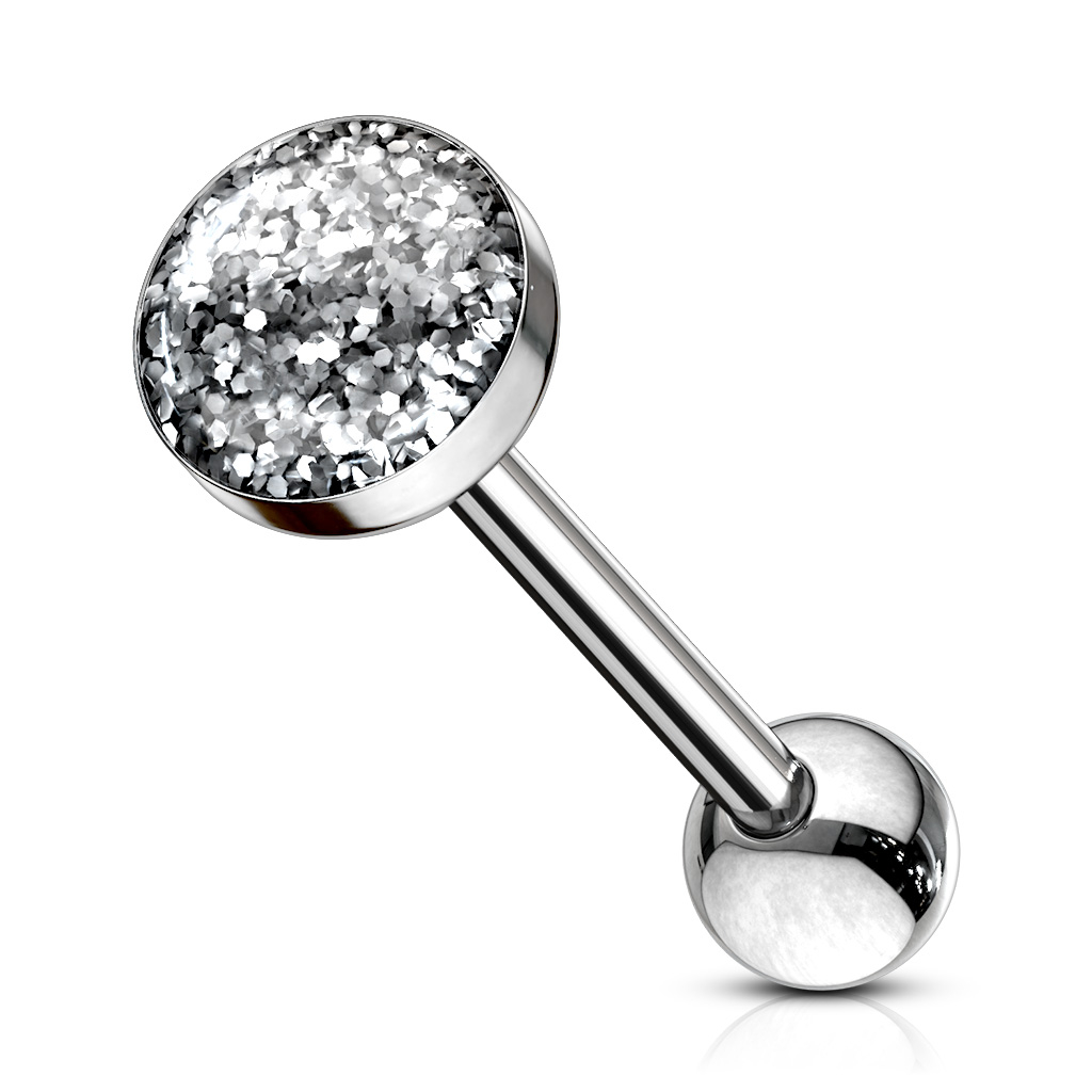 Wir haben sieben Farben zur Auswahl, die in Form von vielen Glitzerpartikeln unter einer Art Plastikschicht gesammelt wurden. Genau aufgrund dieser farbigen Glitzerpartikel, wird dein Zungenpiercing schimmern und funkeln, wenn du den Mund öffnest und das Licht hereinfällt.